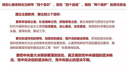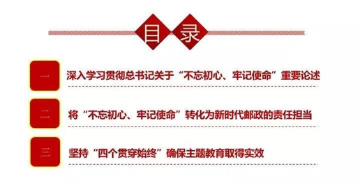 不忘初心再出發(fā),牢記使命勇?lián)?dāng)。在舉國上下喜迎新中國成立70周年之際,集團(tuán)公司黨組按照中央部署,以上率下,團(tuán)結(jié)帶領(lǐng)各級黨組織和廣大黨員干部,樹牢“四個意識”、堅定“四個自信”、做到“兩個維護(hù)”,切實增強(qiáng)政治自覺、思想自覺、行動自覺,有力有序有效推進(jìn)主題教育深入開展,將初心使命轉(zhuǎn)化為新時代郵政的責(zé)任擔(dān)當(dāng),做到學(xué)思用貫通、知信行統(tǒng)一,確保主題教育取得扎扎實實的成效,以主題教育的成效推動郵政改革發(fā)展、創(chuàng)新轉(zhuǎn)型取得新突破、邁上新臺階。