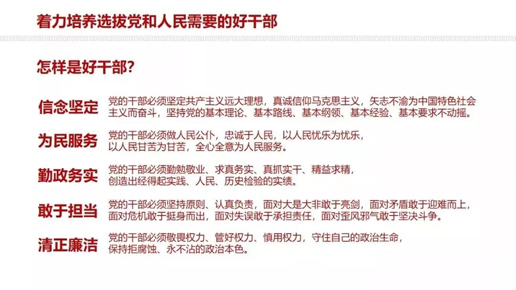 習(xí)近平總書記強(qiáng)調(diào),好干部的標(biāo)準(zhǔn),大的方面說,就是德才兼?zhèn)?。同時,好干部的標(biāo)準(zhǔn)又是具體的、歷史的。不同歷史時期,對干部德才的具體要求有所不同。