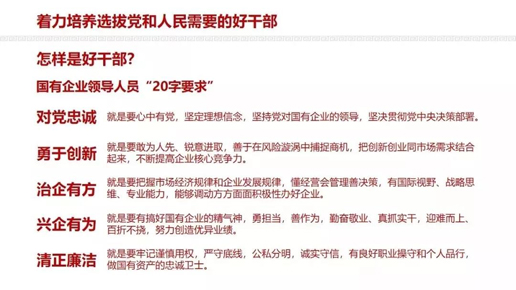 在全國國有企業(yè)黨的建設(shè)工作會議上,習(xí)近平總書記對國有企業(yè)領(lǐng)導(dǎo)人員提出了對黨忠誠、勇于創(chuàng)新、治企有方、興企有為、清正廉潔的“20字要求”。劉愛力在領(lǐng)學(xué)時表示,中國郵政將習(xí)近平總書記對國有企業(yè)領(lǐng)導(dǎo)人員的“20字要求”作為選拔干部、培養(yǎng)干部、考核干部的根本遵循,嚴(yán)格貫徹執(zhí)行《黨政領(lǐng)導(dǎo)干部選拔任用工作條例》,堅持好干部標(biāo)準(zhǔn),把政治標(biāo)準(zhǔn)放在第一位。