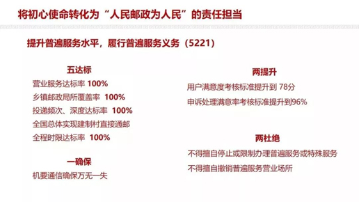 自1998年郵電分營以來,中國郵政取得巨大成就,但是,新時代黨和國家對中國郵政提出了新的要求,必須將“不忘初心、牢記使命”轉(zhuǎn)化為新時代郵政的責(zé)任擔(dān)當(dāng)?!叭嗣襦]政為人民”,滿足人民群眾日益增長的美好用郵需求,就是踐行“為人民謀幸?!钡闹袊]政責(zé)任所在。