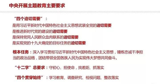 開展這次主題教育,就是要堅持思想建黨、理論強(qiáng)黨,堅持學(xué)思用貫通、知信行統(tǒng)一,推動廣大黨員干部不斷增強(qiáng)“四個意識”、堅定“四個自信”,堅決做到“兩個維護(hù)”,最關(guān)鍵的是堅決維護(hù)習(xí)近平總書記黨中央的核心、全黨的核心地位,做到“三個體現(xiàn)在”:體現(xiàn)在與黨中央保持高度一致上,體現(xiàn)在嚴(yán)守黨的政治紀(jì)律和政治規(guī)矩上,體現(xiàn)在堅決貫徹落實黨中央重大決策部署上。