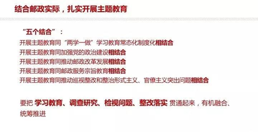 劉愛力提出,開展主題教育要做到“五個結(jié)合”:開展主題教育同“兩學(xué)一做”學(xué)習(xí)教育常態(tài)化制度化相結(jié)合,同加強(qiáng)黨的政治建設(shè)相結(jié)合,同推動郵政改革發(fā)展相結(jié)合,同郵政服務(wù)宗旨教育相結(jié)合,同推動巡視整改和整治形式主義、官僚主義突出問題相結(jié)合。他深入闡述了如何將學(xué)習(xí)教育、調(diào)查研究、檢視問題、整改落實貫通起來,有機(jī)融合,統(tǒng)籌推進(jìn)。