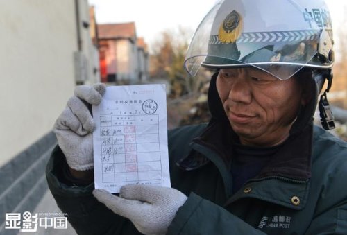 在他的這條郵路上,有5個郵政排單的蓋章點,他每天都會認認真真的蓋完。圖為董乃軍在張家洞村展示已經(jīng)蓋完印章的排單。