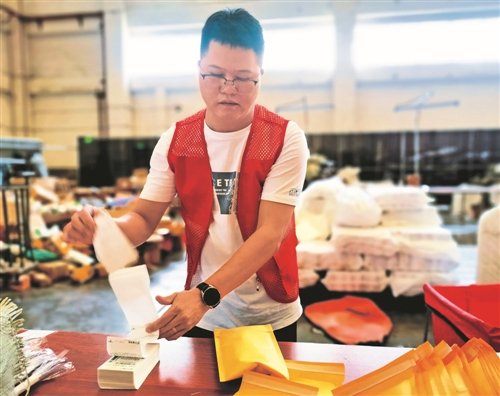 倉(cāng)儲(chǔ)人員將打包好的郵件進(jìn)行貼單處理。□殷建國(guó) 攝