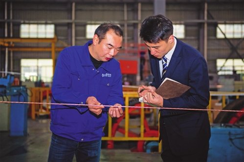 福建省分行客戶(hù)經(jīng)理(右)走訪(fǎng)小微企業(yè)、了解生產(chǎn)情況。