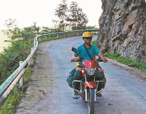 張林昌騎行在貴州省錦屏縣河口鄉(xiāng)培隴村的公路上。楊曉海攝(中經(jīng)視覺)