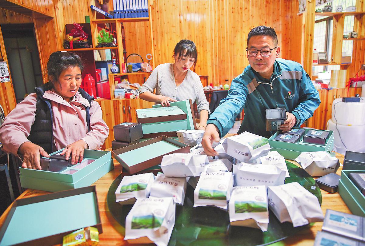 郵政攬投員與茶廠員工一起分裝茶葉?!跣炖住z
