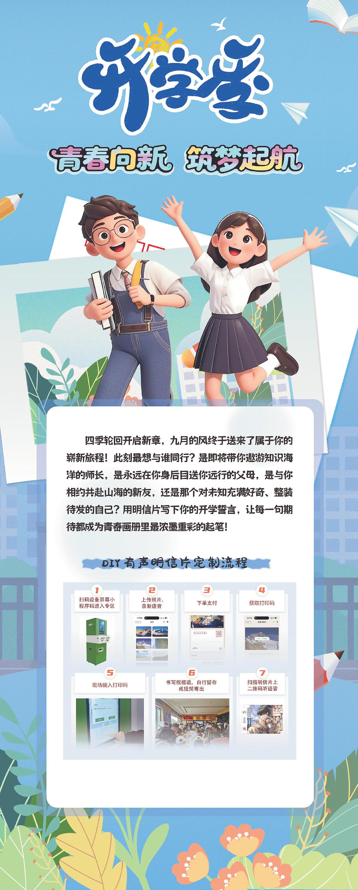 9月6日是鷹潭職業(yè)技術(shù)學(xué)院開(kāi)學(xué)的日子。鷹潭市月湖區(qū)郵政分公司郵政業(yè)務(wù)部主任熊銀萍帶領(lǐng)同事,一早就守在校園郵政快遞驛站門(mén)口?!?元體驗(yàn)DIY有聲明信片”的廣告展架剛擺出來(lái),就吸引了學(xué)子們駐足——他們與家人溫馨合影,和朋友歡樂(lè)抓拍,捕捉校園里的第一抹秋色,開(kāi)啟大學(xué)生活的第一張自拍……這些精彩瞬間都被有聲有色地記錄在小小的明信片上。當(dāng)天,500余枚DIY明信片從這里發(fā)出。熊銀萍看著學(xué)子們的笑臉欣慰地說(shuō):“這些承載夢(mèng)想與祝福的卡片,將陪伴他們一起走向更加美好的未來(lái)!”