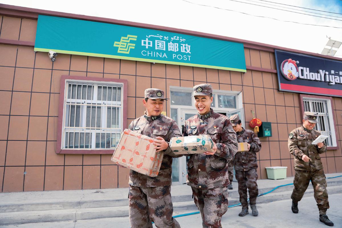 直達(dá)新疆葉城縣三十里營(yíng)房地區(qū)的郵路開通后,駐地部隊(duì)官兵從郵政服務(wù)點(diǎn)高興地取出包裹。