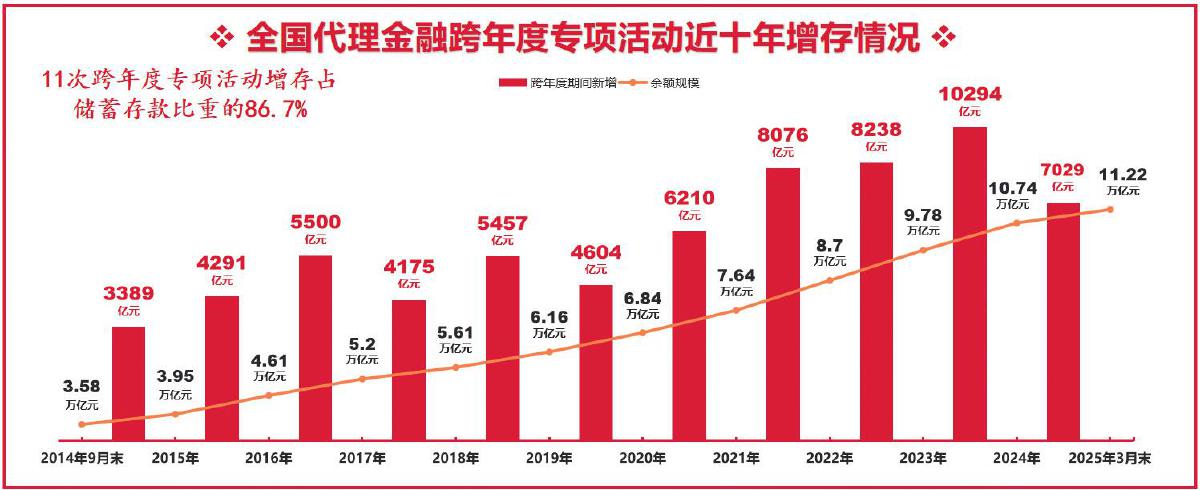 2015年6月,集團公司發(fā)文設(shè)立儲匯業(yè)務(wù)處等代理金融管理處室,隨后在全國郵政金融開展“郵銀一家 共拓藍?!睂m棤I銷活動,對郵銀先進單位、先進個人進行表彰。2016年,為進一步調(diào)動各級機構(gòu)加快代理金融發(fā)展的積極性,確保儲蓄存款規(guī)模穩(wěn)定增長,集團公司、集團工會創(chuàng)新推出全國代理金融爭創(chuàng)“十強百優(yōu)千佳”(十強省份、百優(yōu)地市、千佳網(wǎng)點)勞動競賽,激勵直達網(wǎng)點一線,當年初見成效;為搶抓歲末年初旺季發(fā)展機遇,進一步發(fā)揮郵政大網(wǎng)資源優(yōu)勢,有效整合社會資源,全力推進代理金融“融合發(fā)展 科學發(fā)展”,力爭實現(xiàn)資金流量最大化,提質(zhì)增效,有效引導代理金融持續(xù)、健康、科學發(fā)展,在2017—2018跨年度期間再次開展全國郵政代理金融“十強百優(yōu)千佳”營銷活動,并延續(xù)至今,逐步加大完善重點業(yè)務(wù)發(fā)展支撐力度。同時,通過連年組織多部門多專業(yè)參加全國郵政代理金融“融合發(fā)展 科學發(fā)展”培訓班,在《中國郵政報》開辟專欄,編發(fā)通報、案例,召開專題會、現(xiàn)場會、遠程會,搭建交流分享平臺,層層傳導“集聚資源 協(xié)同合作 全國聯(lián)動 聚合客群”營銷方式。郵銀協(xié)同、專業(yè)融合、合作多贏,不斷豐富代理金融產(chǎn)品、服務(wù)、功能、品牌,跳出存款抓存款?!皥罂?金融”融合推出營業(yè)網(wǎng)點“素質(zhì)教育主題郵局”服務(wù)品牌。經(jīng)教育部批準,開展全國中小學生創(chuàng)新作文大賽,在江西贛州、重慶萬州等地賽區(qū)獲客獲金成效顯著。2020年,在全國部署深入開展“一城一局一?!彼刭|(zhì)教育主題營銷活動,培育壯大全國性幼兒少年學生及其家長、學校價值客群。郵銀協(xié)同項目獲集團公司、全國通信行業(yè)創(chuàng)新管理年度獎項。集團公司推出郵樂網(wǎng)“郵惠購”全國客戶積分兌換活動,有效活客黏客?!?014年末至2025年首季,代理金融儲蓄存款累增7.55萬億元,規(guī)模突破11萬億元,業(yè)務(wù)收入年均增幅超15%,以“十強百優(yōu)千佳”勞動競賽為抓手的11次跨年度專項活動成為近年來代理金融客戶規(guī)模、儲蓄存款、業(yè)務(wù)收入持續(xù)較快增長的“主引擎”。