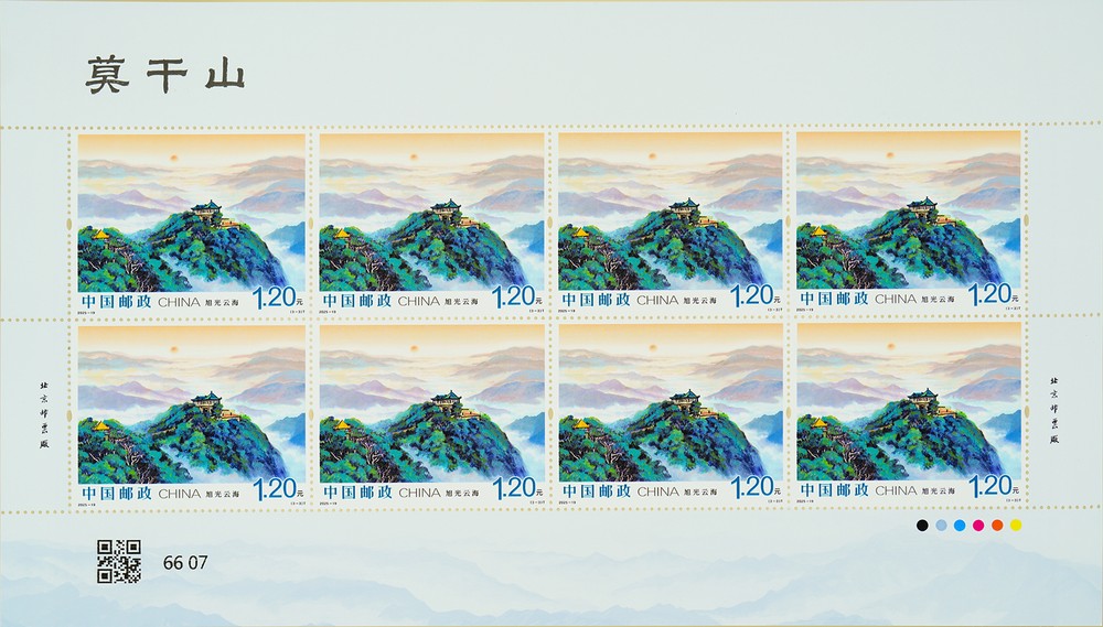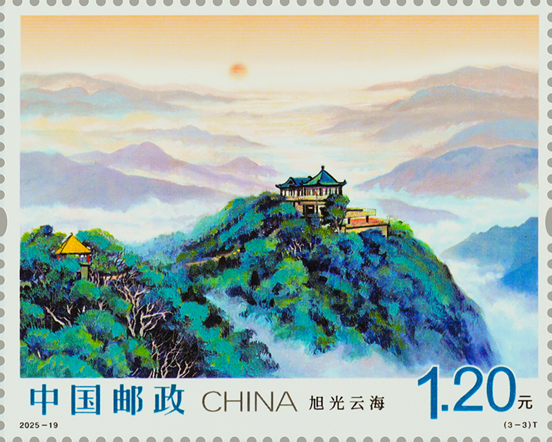 第三枚“旭光云?!保枥L了莫干山的日出景象。該枚郵票定格了莫干山旭日東升的壯麗景象,旭光臺(tái)作為莫干山觀賞日出的絕佳觀景臺(tái),將天地交輝的盛景盡收眼底。遠(yuǎn)山如黛,云濤似海,萬(wàn)道金芒為連綿山巒披上錦袍,昭示著此刻的莫干山正以更輝煌的姿態(tài)擁抱嶄新的未來(lái)。